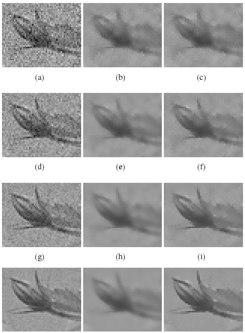 From left to right, the first column shows the noisy images, the second column shows the bilateral filtered images with a h parameter fixed to 100, the third column shows the results obtained with our proposed method.